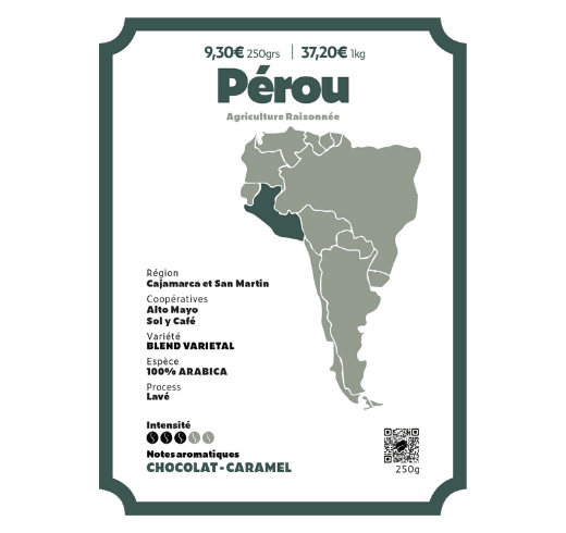 Ce café est issu de plusieurs coopératives situées essentiellement en zone montagneuse, à l’ombre de la forêt. Le Pérou est l’un des pays majeurs dans l’exportation du café équitable.